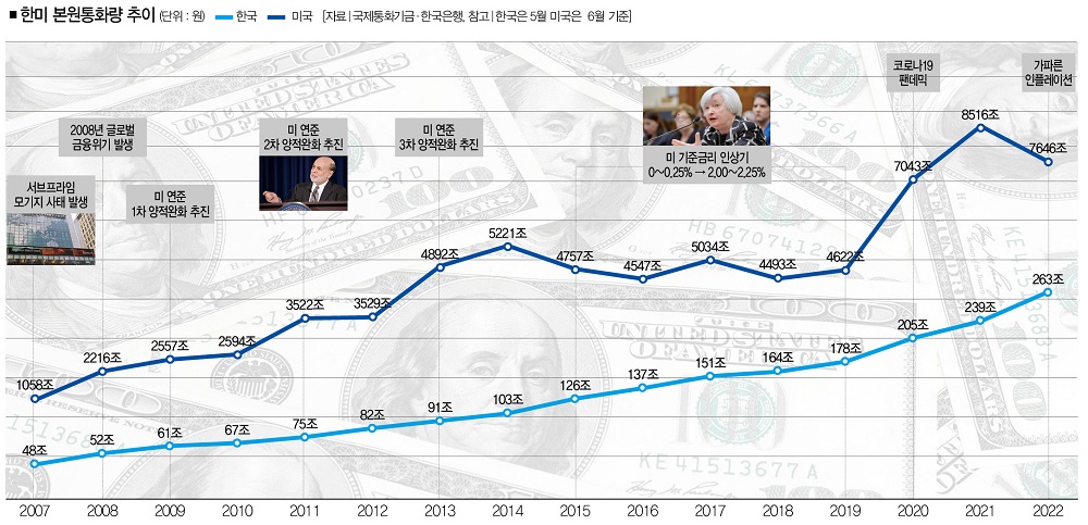미 연준은 2015년 12월 기준금리를 0.25~0.5%포인트로 인상할 때까지 약 7년간 제로금리를 유지했다. 시장에 풀린 돈은 어마어마했다. 미 연준에 따르면 2007년 1058조1726억원이었던 본원통화량은 2014년 5221조2160억원으로 5배 가까이(4163조434억원) 증가했다.