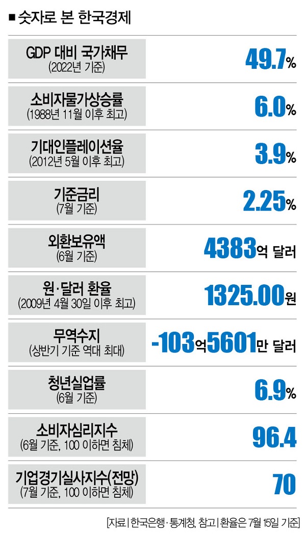 ■인플레이션과 윤석열의 선택 = 이는 한국경제에 시사하는 바가 크다. 대외변수에 취약한 한국경제가 위기에 빠질 가능성이 높아서다. 위기는 이미 현실화하고 있다. 한국경제는 고환율·고금리·고물가라는 최악의 상황과 맞닥뜨렸다.