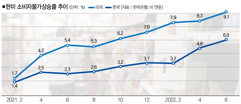미국뿐만이 아니다. 한국의 소비자물가상승률은 6월 6.0%를 기록하며 1998년 11월(6.8%) 이후 약 24년 만에 가장 높은 상승폭을 기록했다. 유로존의 소비자물가상승률은 6월 8.6%로 치솟으며 역대 최고치를 경신했다.