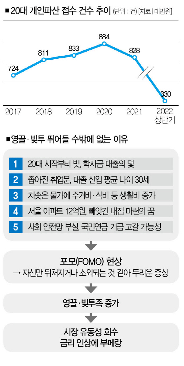 [※참고: 물론 여기선 전제로 둬야 할 게 있다. 모든 20대가 빚투나 영끌에 빠진 건 아니라는 거다. 지금 20대가 어려움에 처한 게 오로지 빚투나 영끌 때문인 것도 아니다. 장혜영(정의당) 의원실에 따르면 신용회복위원회로부터 채무조정 특례 지원(2019년~2022년 6월)을 받은 청년 중 51.3%의 사유가 ‘생계비 증가’와 ‘실직’이었다. 주식 등 ‘투자 실패’로 채무조정을 받은 이는 0.8%에 불과했다. 위기에 빠진 20대를 모두 영끌·빚투족으로 몰아세우는 건 심각한 오류를 낳을 수 있다는 거다. 그렇다고 영끌·빚투에 빠진 이들을 ‘한탕주의’로 매도해서도 안 된다. 그들에겐 영끌을 할 수밖에 없었던 어쩔 수 없는 사유가 있었다. 20대를 둘러싼 환경과 사회 시스템도 생각해봐야 한다는 거다. 이 기사에선 그런 것들을 두루 다뤘다.]