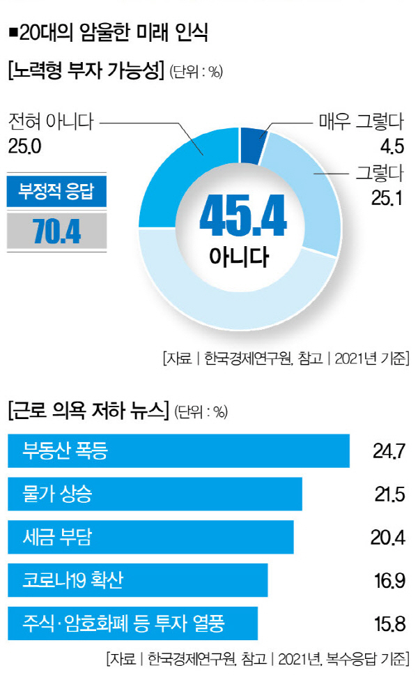 일례로 청년 10명 중 7명은 ‘열심히 일해도 부자가 될 수 없다’고 생각한다. 한국경제연구원이 전국 20대 청년을 대상으로 ‘청년 일자리 인식 설문조사(2021년)’를 실시한 결과, 전체의 70.4%가 “열심히 일해도 부자가 될 수 없다”고 답했다. 노력으로 부자가 될 수 있다고 생각하는 응답자는 29.6%에 불과했다.