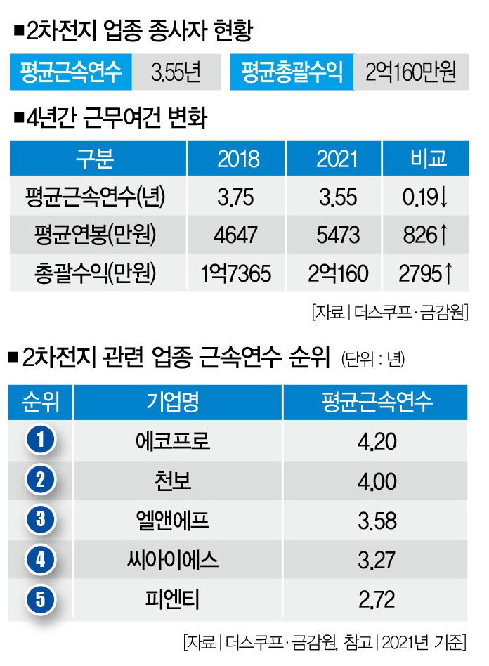 일례로 2차전지용 양극활물질 등을 생산하는 엘앤에프를 보자. 이 기업의 2021년 평균근속연수는 3.58년이다. 2018년(4.92년) 대비 1.34년이 줄었다. 2차전지 관련 기업 중 감소치가 가장 컸다.