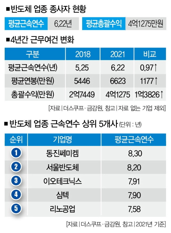 그래서일까. 반도체 기업들은 코로나19 이전과 비교해 평균근속연수가 늘었다. 2018년엔 17개 기업 평균근속연수가 5.25년이었는데, 3년 만에 약 1년(0.97년) 더 늘어 6.22년으로 집계됐다. 100대 기업 평균보다 긴 셈이다. 2021년 기준, 평균근속연수가 가장 긴 기업은 동진쎄미켐(8.40년)이다. 서울반도체(8.20년), 이오테크닉스(7.91년) 근속연수도 코스닥 100대 기업 평균(5.16년)을 웃돈다.
