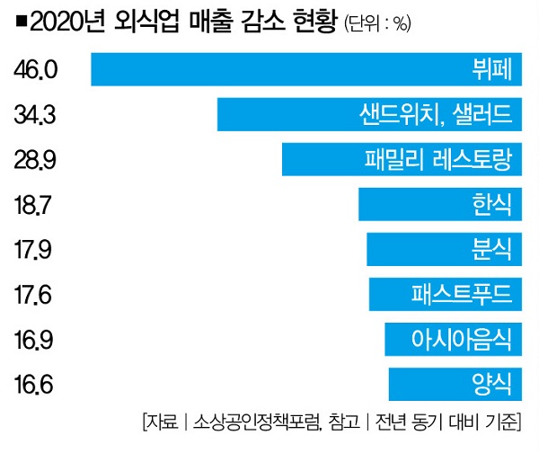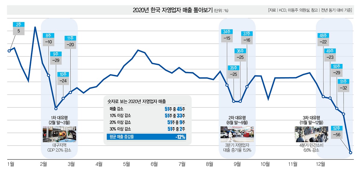 이들의 매출은 12월 첫째주인 49주차엔 23%, 50주차엔 29%, 51주차엔 32% 줄어들었다. 확진자 수가 정점을 찍은 2020년 마지막 주(51주차)엔 매출도 56% 줄어들어 최악의 성적표를 냈다. 2020년은 자영업계가 파멸적 피해를 입은 해다. 51주 중 6주를 제외한 45주의 매출이 전년 동기 대비 감소했으니, 그보다 더 적합한 표현은 없다.