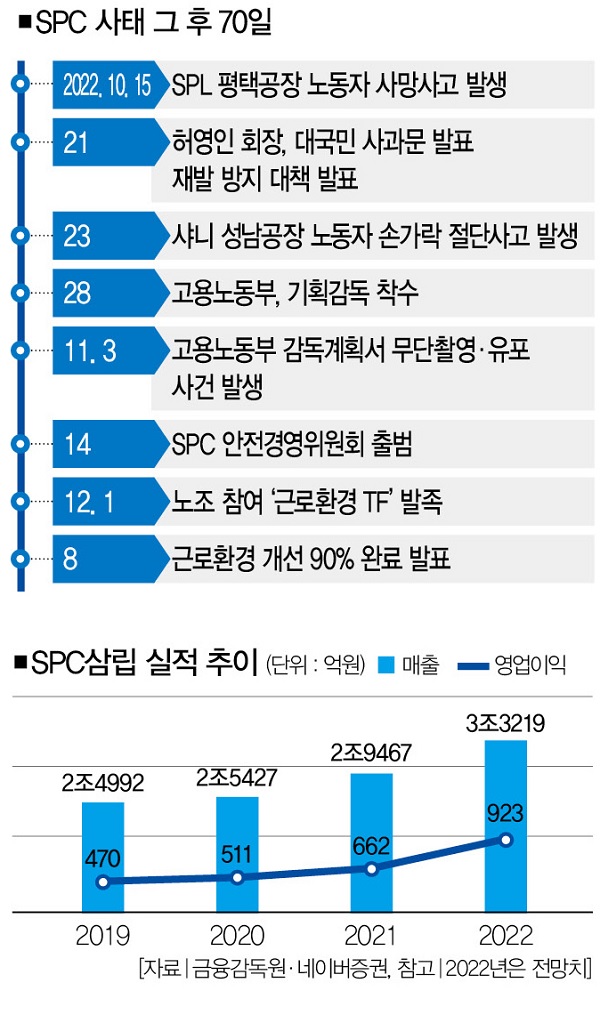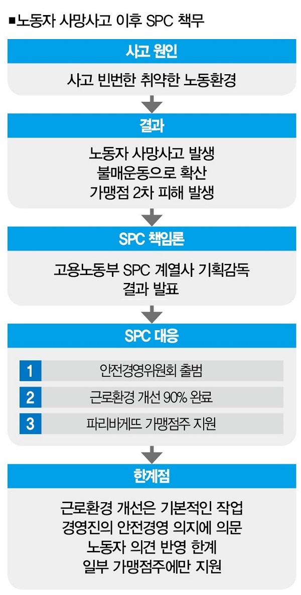 [※참고: 고용노동부는 12월 28일 SPC 산업안전·근로기준 기획감독 결과를 발표했다. SPC 계열사 사업장 중 86.5%(45개소)에서 277건의 산업안전법 위반 사항을 적발해 과태료 6억원을 부과했다. 아울러 12억원대 임금 체불, 비정규직 근로자 차별, 특별 연장근로 등 노동 관계법 위반사항 116건을 적발했다.]