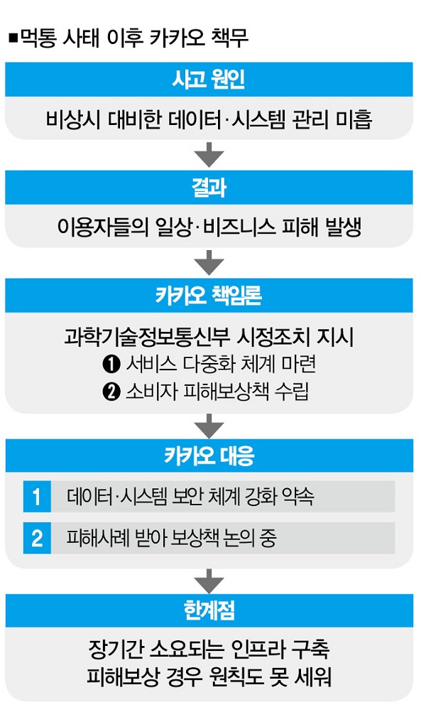 데이터 보안 및 시스템 정비에 소홀했던 카카오엔 곧바로 책임론이 뒤따랐다. 서비스 장애 기간에 속출한 소비자의 피해를 카카오에서 보상해야 한다는 여론이 들끓었다. 김범수 카카오 창업자(미래이니셔티브센터장), 홍은택 카카오 대표는 “책임을 통감한다”면서 피해보상을 위해 최선을 다하겠다고 약속했다. 화마火魔가 휩쓸고 간 자리에는 카카오가 해결해야 할 과제들이 산적해 있었다.