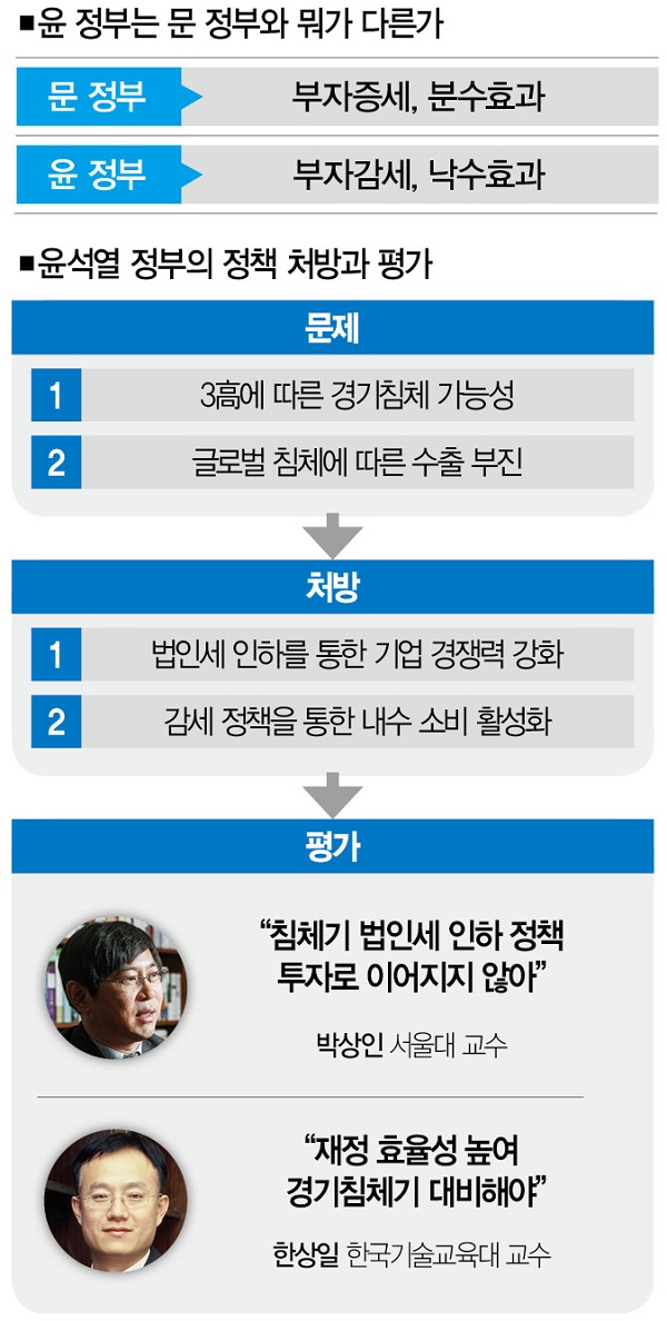 그렇다면 경기침체에 대비하는 윤석열 정부의 해법은 무엇일까. 윤 정부의 정책은 감세와 규제 완화 두개로 요약할 수 있다. 이중 감세정책을 살펴보자. 윤 정부는 기업과 가계의 세금 부담을 완화해 소비 침체를 막고 기업의 성장을 도모하겠다는 계획이다.