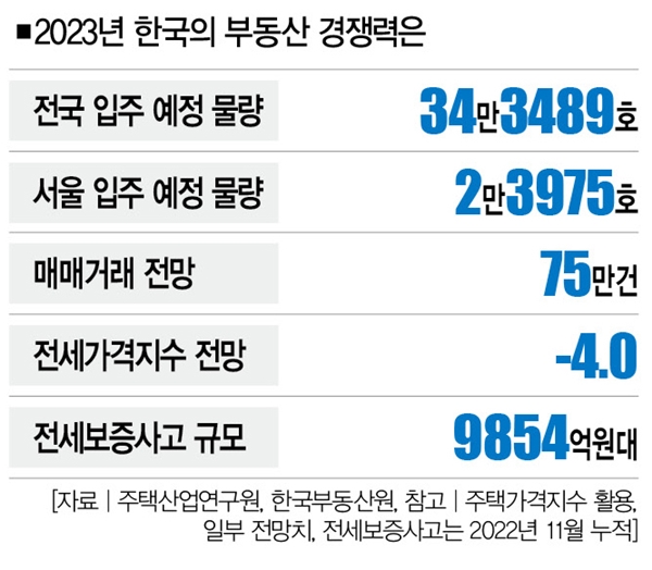 7월말 예상됐던 전세대란도 벌어지지 않았다. 되레 전세 시세가 떨어지며 후임 세입자를 받아도 기존 세입자의 보증금을 돌려줄 수 없는 ‘깡통주택’이 늘어났고, 엎친 데 덮친 격으로 전세보증보험 사고가 증가했다. 한국부동산원에 따르면, 전세보증사고 규모는 2022년 11월을 기준으로 1903억원, 발생 건수는 869건이었다. 집주인이 전세 보증금을 돌려주지 못한 경우가 그만큼 많았다는 거다.