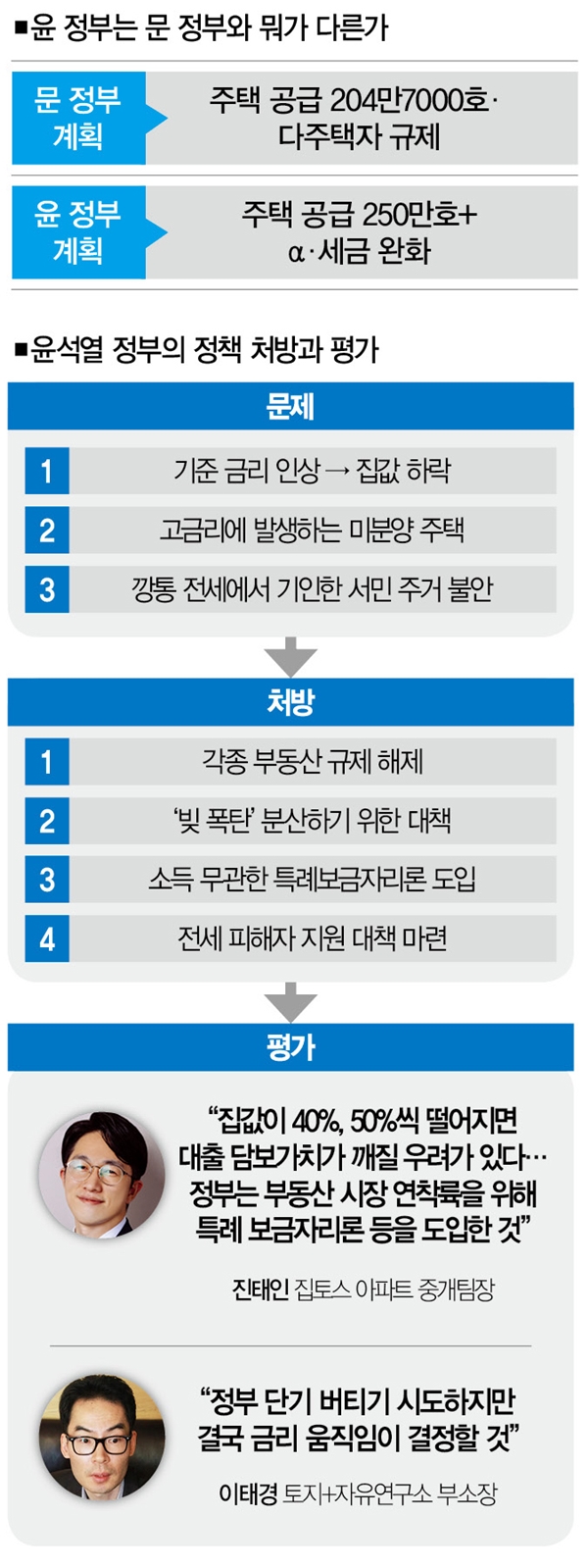 부동산 규제는 2023년 초 대부분 해제됐다. 집값이 더 오르기는커녕 2022년 8월 급격하게 떨어지기 시작했기 때문이다. 임대차 2법 탓에 터질 것이라던 전세난은 되레 ‘역전세난’으로 돌아왔다. 윤석열 정부는 돈이 없어 무너지려는 부동산 시장에 대출 보증 등으로 처방을 내렸다. 과연 현실에 걸맞은 처방전일까.