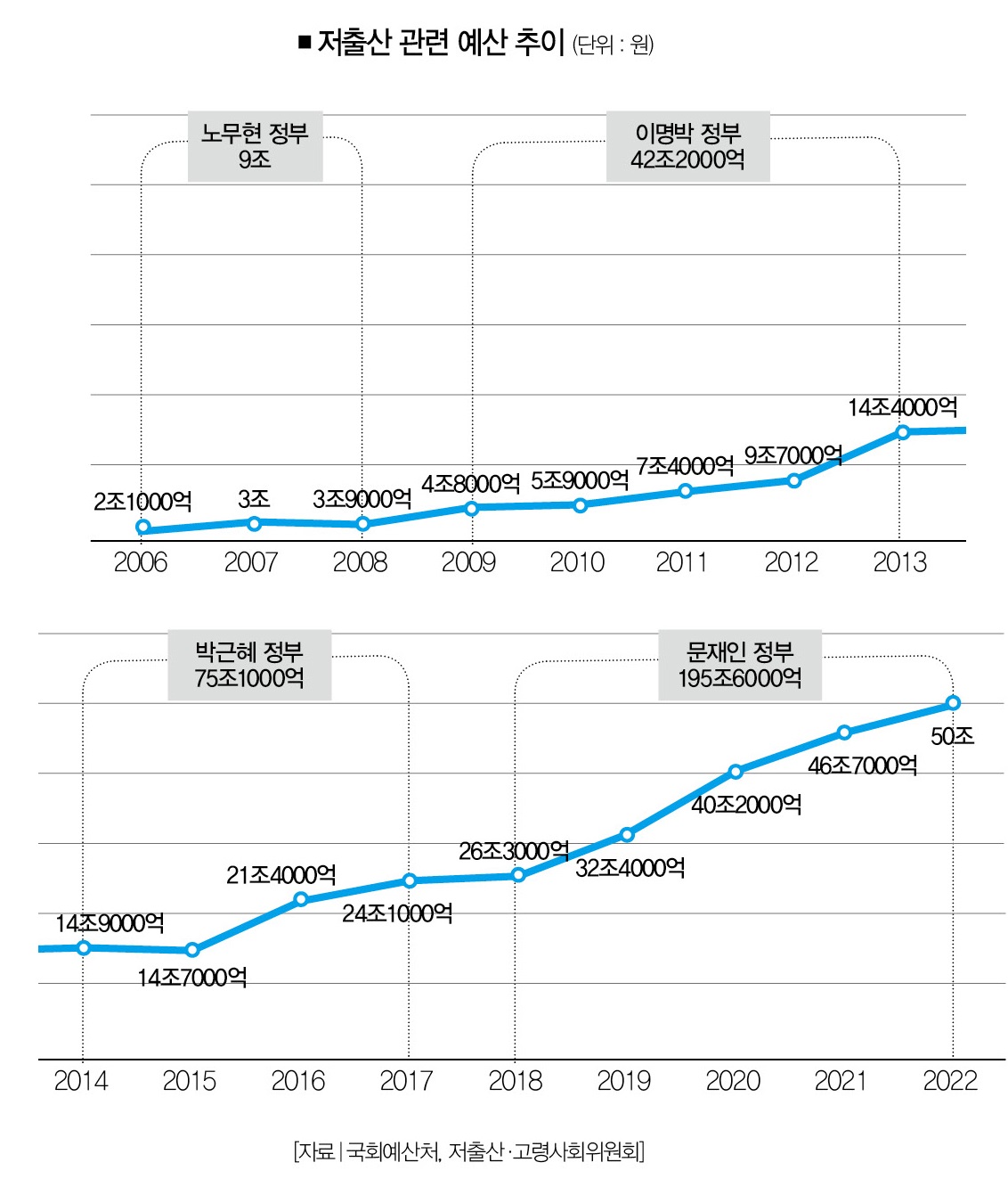 국회예산처에 따르면 2006년부터 2021년까지 사용한 저출산 관련 예산은 271조원에 이른다. 지난해 50조원 안팎의 예산을 더 투입했다는 걸 감안하면 320조원이 넘는 돈이다. 그럼에도 출산율이 떨어지고 있다는 건 정부 정책이 실패했다는 방증이다. 그럼 역대 정부의 저출산 대책이 실패한 까닭은 뭘까.
