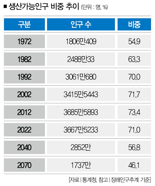 그럼에도 생산가능인구가 줄어드는 건 좋은 시그널이 아니다. 자동화란 4차산업혁명 기술도 한계가 있을 수밖에 없다. 노인인구의 노동참여를 높이기 위해 정년을 마냥 늘리는 것도 쉽지 않다. 반대로 생산가능인구의 감소로 발생하는 문제는 한두개가 아니다.