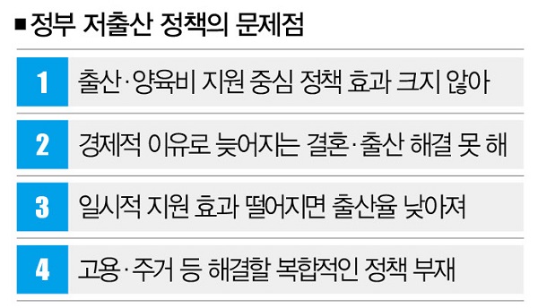 사실 저출산 문제는 단순히 아이를 낳고, 낳지 않고의 이슈가 아니다. 이는 경제 전체를 아우르는 문제다. 바늘구멍보다 좁아진 취업문, 월급을 모아선 장만할 수 없는 내집, 경기침체로 인한 불경기 등 다양한 경제적 요인이 영향을 미친다.