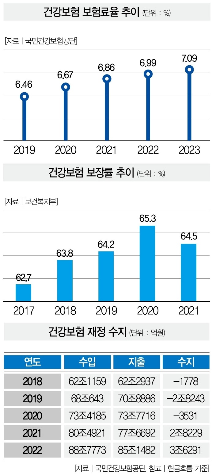 반면, 보험료는 오르고 건강보험 보장률은 떨어졌던 2021년엔 건강보험 재정 수지도 2조8229억원의 흑자를 기록했습니다. 건보공단이 의료보험금으로 지급한 돈보다 보험료로 벌어들인 수입이 더 많았다는 방증입니다.