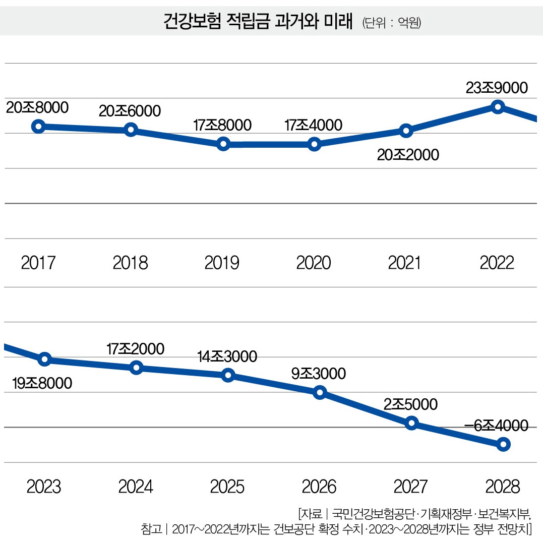 정부(기획재정부ㆍ보건복지부)의 추계에 따르면 올해 적립금은 19조8000억원으로 감소세를 타기 시작해 2028년에는 6조4000억원의 적자를 내며 고갈될 것으로 전망합니다.