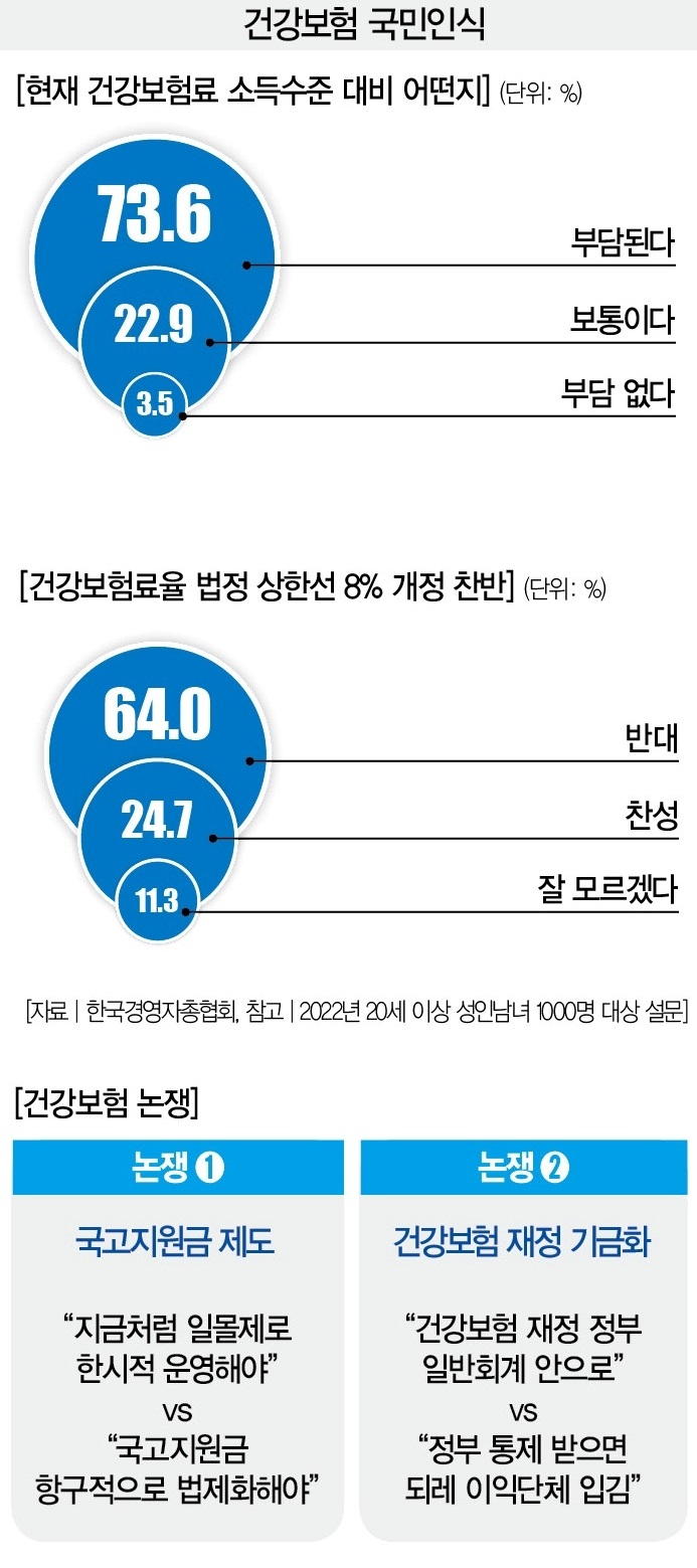실제 여론조사에서도 이와 다르지 않은 결과가 나왔습니다. 지난해 한국경영자총협회가 20세 이상 시민 1000명을 대상으로 흥미로운 설문을 진행했습니다. 현재 건강보험료가 소득 대비 어떤 수준인지 물었는데, 전체 시민의 73.6%가 ‘부담스럽다’고 밝혔습니다. ‘부담이 없다’고 말한 이들은 3.5%에 불과했습니다.