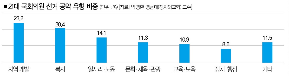 비중은 23.2%로 9개 주요 공약 중 가장 높았다. 지역개발 다음으론 복지(20.4%), 경제·일자리·노동(14.1%), 문화·체육·관광(11.3%) 등의 순이었다.