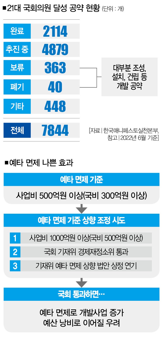 현 예타 체제에서 후보들이 추진한 개발공약이 제대로 지켜지고 있는 것도 아니다. 한국매니페스토실천본부가 지난해 12월 발표한 ‘21대 지역구 국회의원 2년 차 공약 이행 결과 분석 보고서’를 살펴보자.