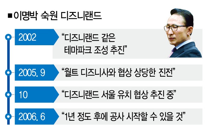 2002년 서울시장에 당선된 이명박(MB) 전 대통령은 “월트 디즈니사와의 테마파크 유치 협상에서 상당한 진전을 이뤄냈다(2005년 9월)” “월트 디즈니 측과 디즈니랜드 서울 유치 협상을 비밀리에 추진 중이다(2005년 10월)”는 말을 시시때때로 흘리면서 디즈니랜드 유치가 확실한 것처럼 군불을 땠다. 하지만 MB의 디즈니랜드 플랜은 첫 삽도 뜨지도 못한 채 수포로 돌아갔다.
