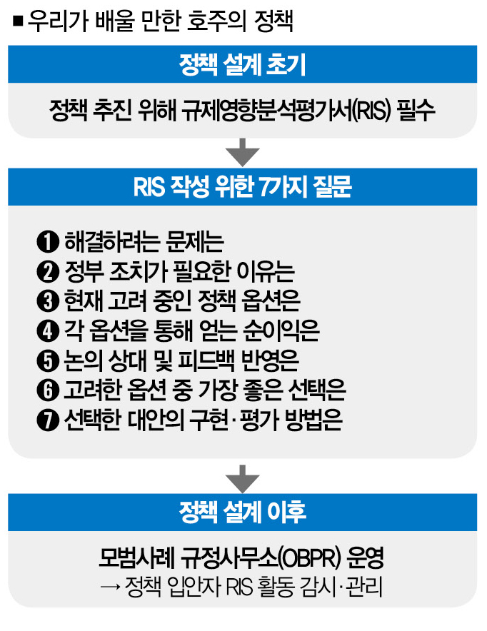 그렇다면 우린 부실한 개발사업과 혈세 낭비를 방지하기 위해 무엇을 준비해야 할까. 여기 참고할 만한 본보기가 있다. 호주 정부가 운영 중인 규제영향분석평가서(RIS·Re gulation impact statements)다. 호주에선 정책을 입안할 때 반드시 7가지 질문에 기반한 RIS를 작성해야 한다. 그 질문들을 나열하면 다음과 같다.