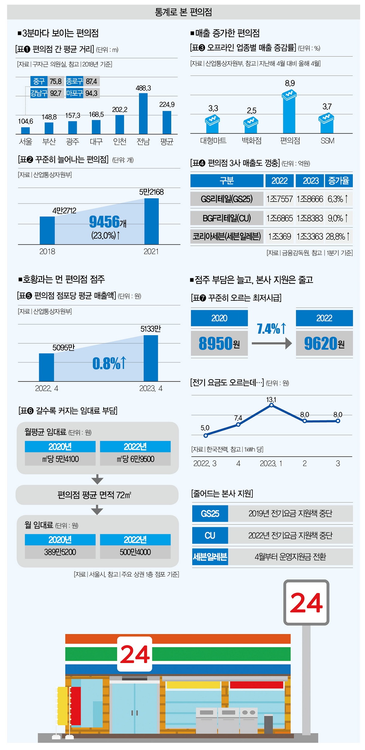 GS25와 CU는 각각 2019년과 지난해 전기요금 지원책을 중단했죠. 세븐일레븐도 4월 신규계약 편의점부터 최대 50%까지 지원했던 전기요금 대신 운영지원금을 주는 방안으로 전환했습니다(표➐).
