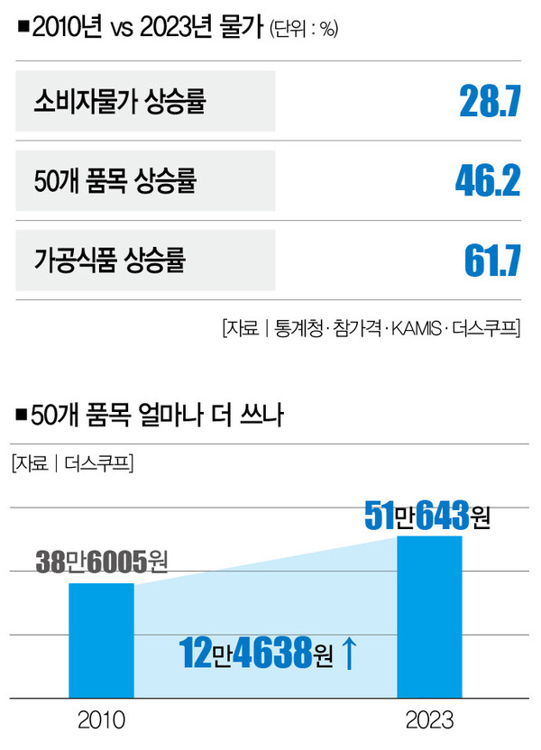 # 물가는 늘 속절없이 치솟았고, 그때마다 민생은 괴로웠다. 가벼워진 지갑으로 할 수 있는 건 점점 줄어들었다. 더스쿠프(The SCOOP)가 식료품ㆍ가공식품 가격을 비롯해 외식비ㆍ교통요금 등 서민들의 삶과 밀접한 50개 품목의 물가를 분석한 결과를 보자. 현재의 물가를 2010년과 비교해보니, 13년 새 50개 품목의 물가는 46.2% 상승했다. 체감물가와 밀접한 가공식품은 61.7%나 치솟았다. 물가지수 상승률 28.7%를 훨씬 웃도는 수치다.