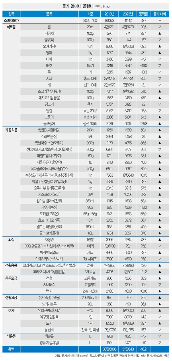 닮은 듯 다른 2010년과 2023년, 13년 새 물가는 얼마나 올랐을까. 식료품ㆍ가공식품ㆍ외식ㆍ생활용품 등 50개 품목을 정해 2010년과 비교해봤다.[※참고: 조사 대상은 2010년과 2023년 통계가 모두 존재하는 품목으로 선정했다. 2010년은 연평균, 20 23년은 6월까지의 평균이다.]