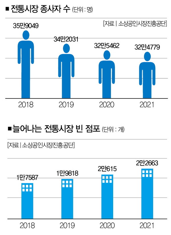 그의 말처럼 전통시장의 일하는 사람은 매년 줄어들고 있다. 소상공인시장진흥공단에 따르면, 전통시장 종사자 수는 2019년 34만2031명에서 2021년 32만4779명으로 감소했다.