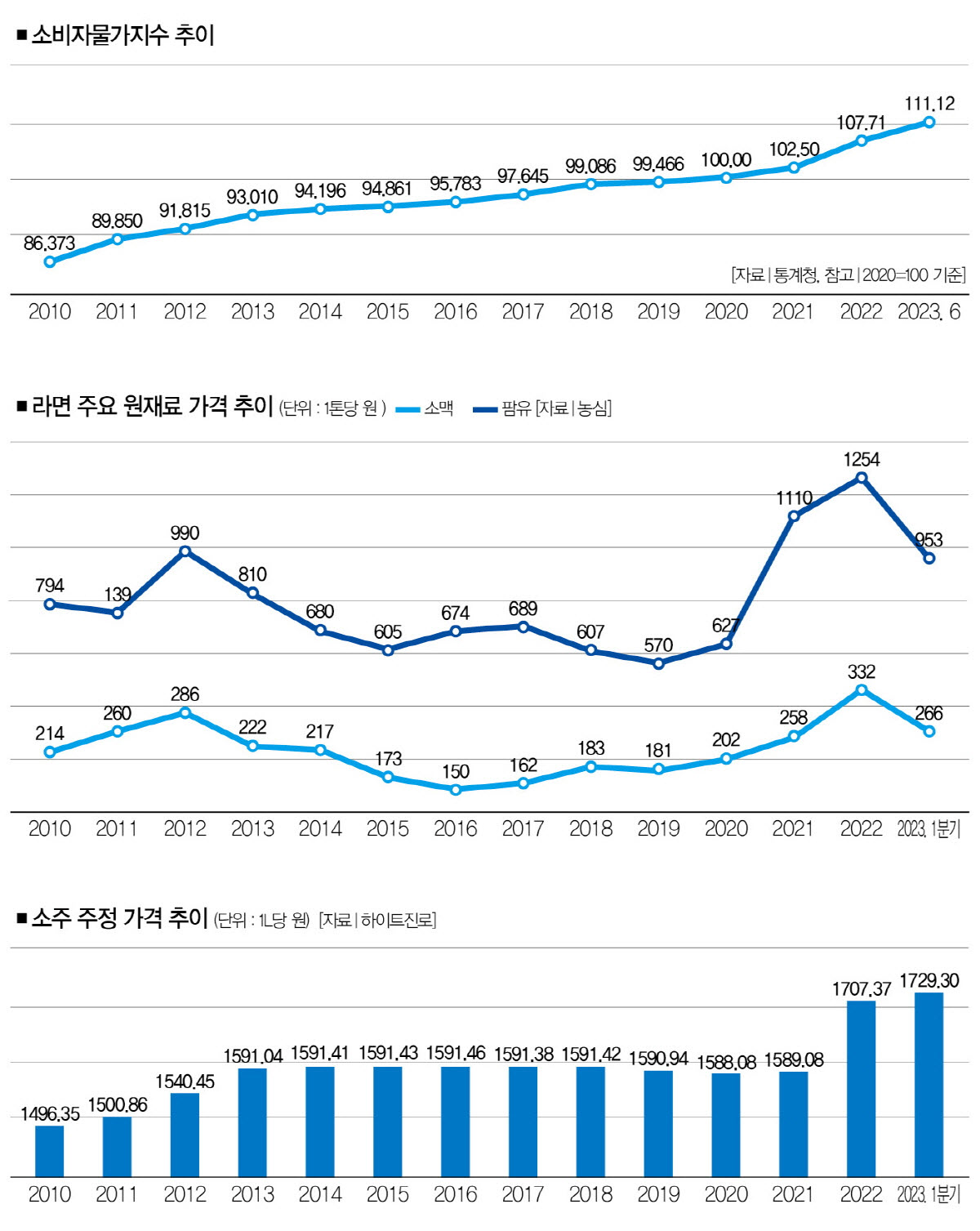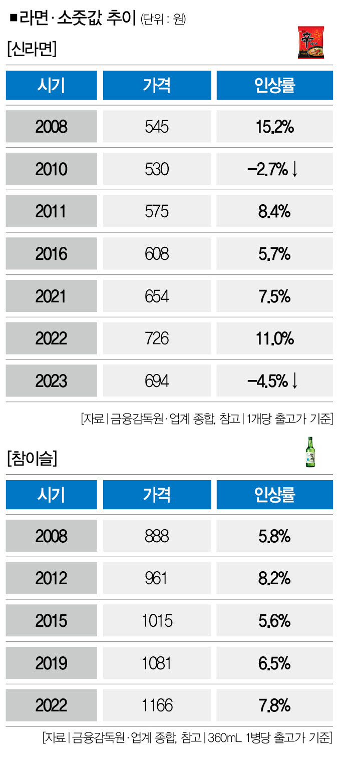 # 하지만 정부가 시시때때로 ‘가격을 내리라 마라’ 할 수는 없는 노릇이다. 결국 가격 결정은 식품업체의 의지에 달려있다. 그럼 지난 10년간 대표 서민식품인 라면과 소주 가격은 어떻게 달라졌을까.