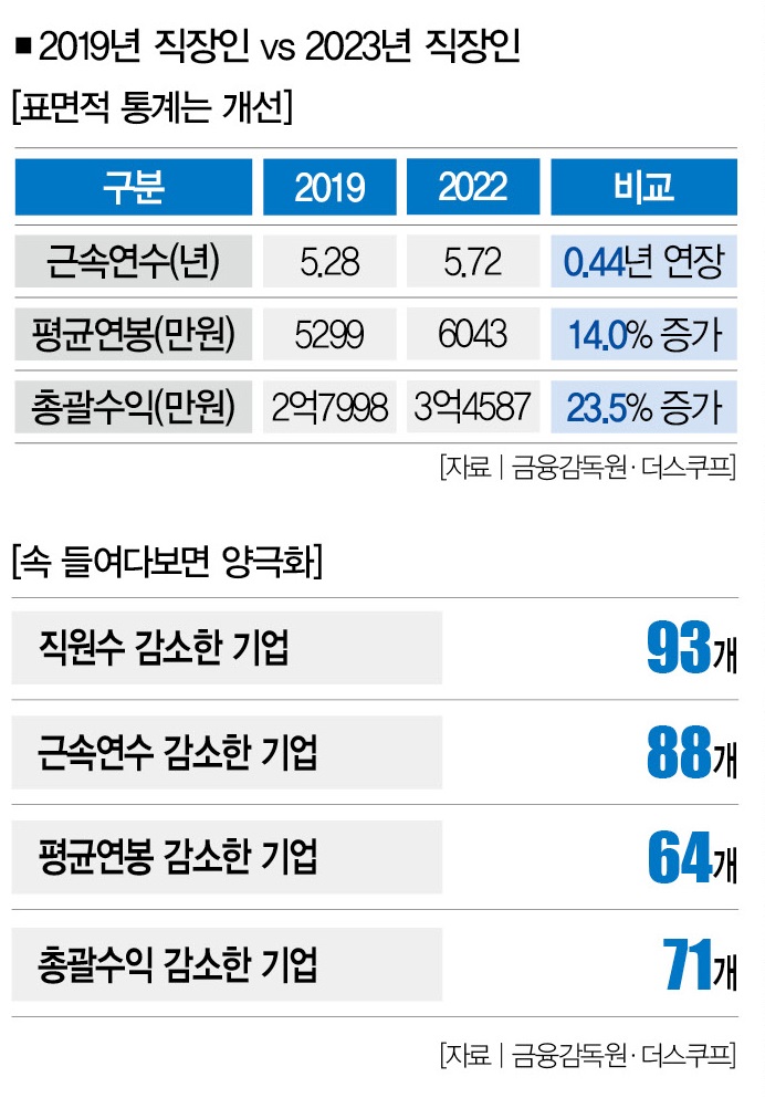 이렇게 버텨서 얻는 성과가 적었던 것도 아니다. 2022년 말 평균연봉은 6043만원으로 팬데믹 전과 비교해 14.0% 증가했다. 한달에 62만원가량 더 쓸 수 있게 된 셈인데, 이 기간(2019~2022년) 소비자물가상승률(8.2%)보다 폭이 컸다.