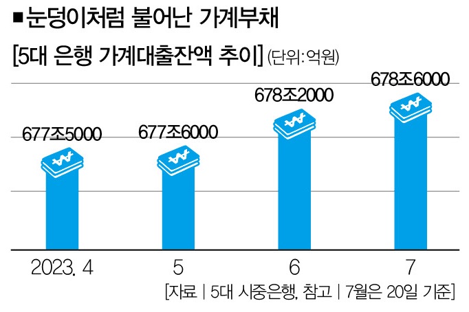 그렇다고 소비가 극적으로 늘어날 상황도 아니다. 가계부채 탓이다. 통화 긴축 기조 속에서도 한국의 가계대출 증가세는 꺾이지 않고 있다. 5대 시중은행(KB국민ㆍ신한ㆍ하나ㆍ우리ㆍNH농협)의 가계대출 잔액은 678조5700억원(7월 20일 기준)으로 6월 말(678조2454억원)보다 3246억원 늘었다.