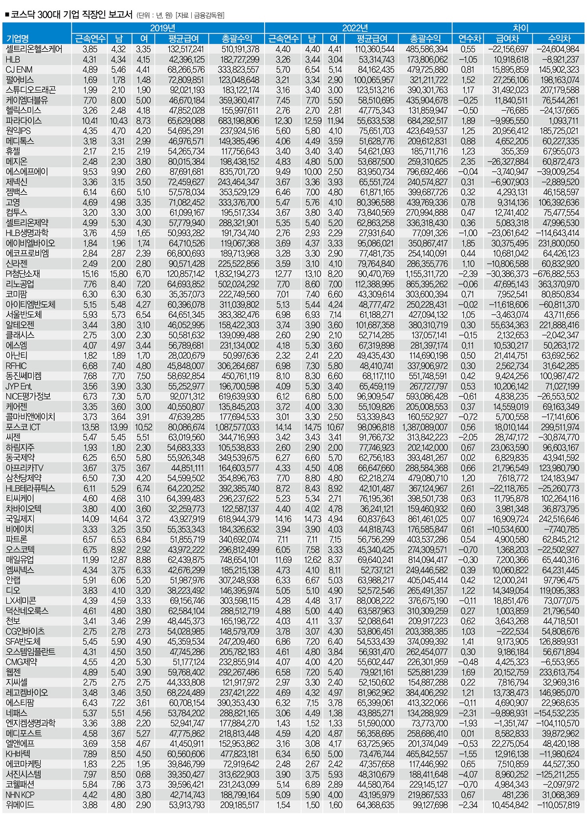 ■ 2막 : 기업 = ‘2023년 직장인 별곡’ 첫번째 편에서 살펴봤듯, 팬데믹 기간 직장인의 처우는 꽤 괜찮아졌다. 팬데믹이 휩쓸기 전 2019년 말 코스닥 300대 기업 직원의 평균 근속연수는 5.28년, 평균연봉은 5299만원이었다. 몹쓸 바이러스의 공포가 수그러든 2022년 말엔 눈에 띄게 달라졌다.