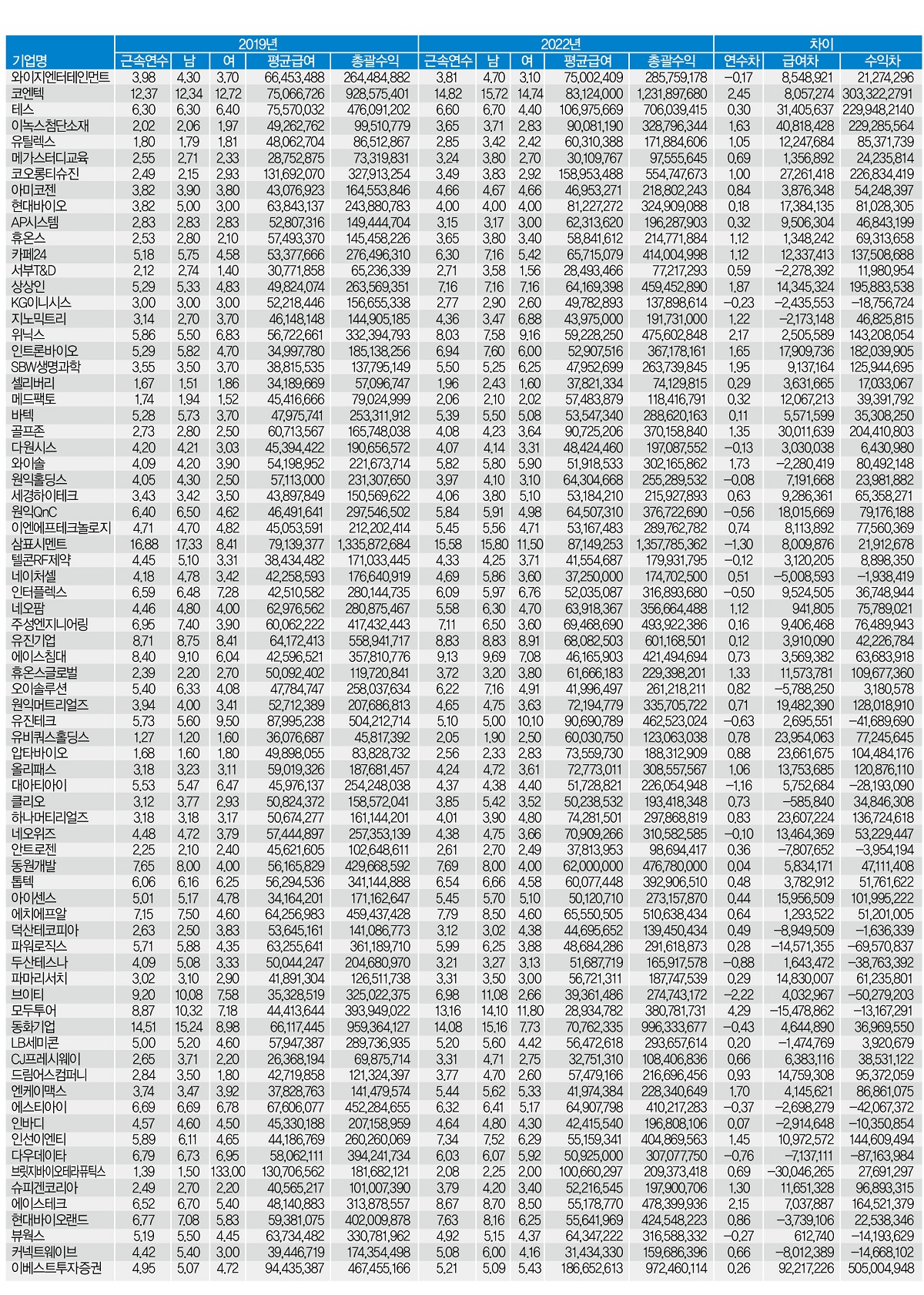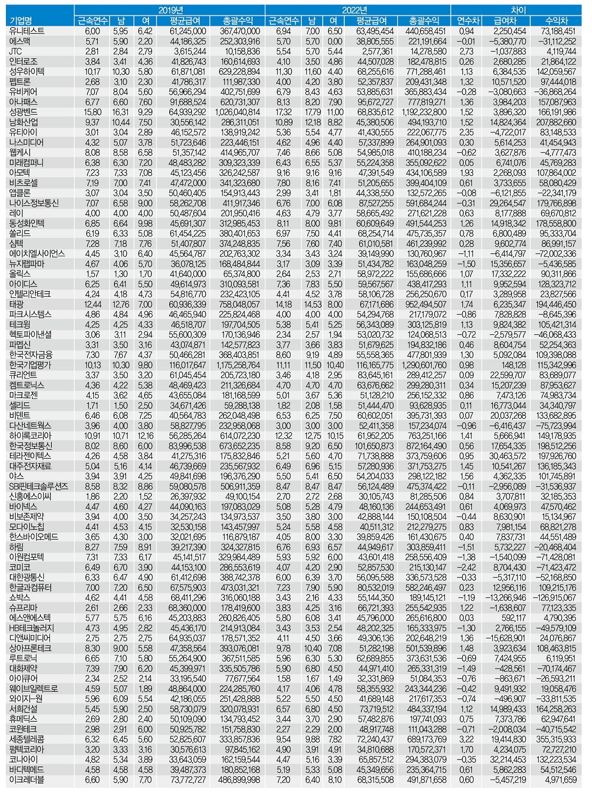 팬데믹 덕분에 고성장을 구가했던 게임 업종의 근무여건 변화 역시 비슷했다. 코스닥 300대 기업에 속한 9개 게임 기업의 평균연봉은 무려 30.5%나 증가했다. 2019년 5666만원이던 평균연봉이 지난해엔 7398만원으로 오르면서 앞자리 숫자를 두 번이나 바꿨다. 평균 근속연수도 3.14년에서 3.64년으로 0.50년이나 길어졌다.