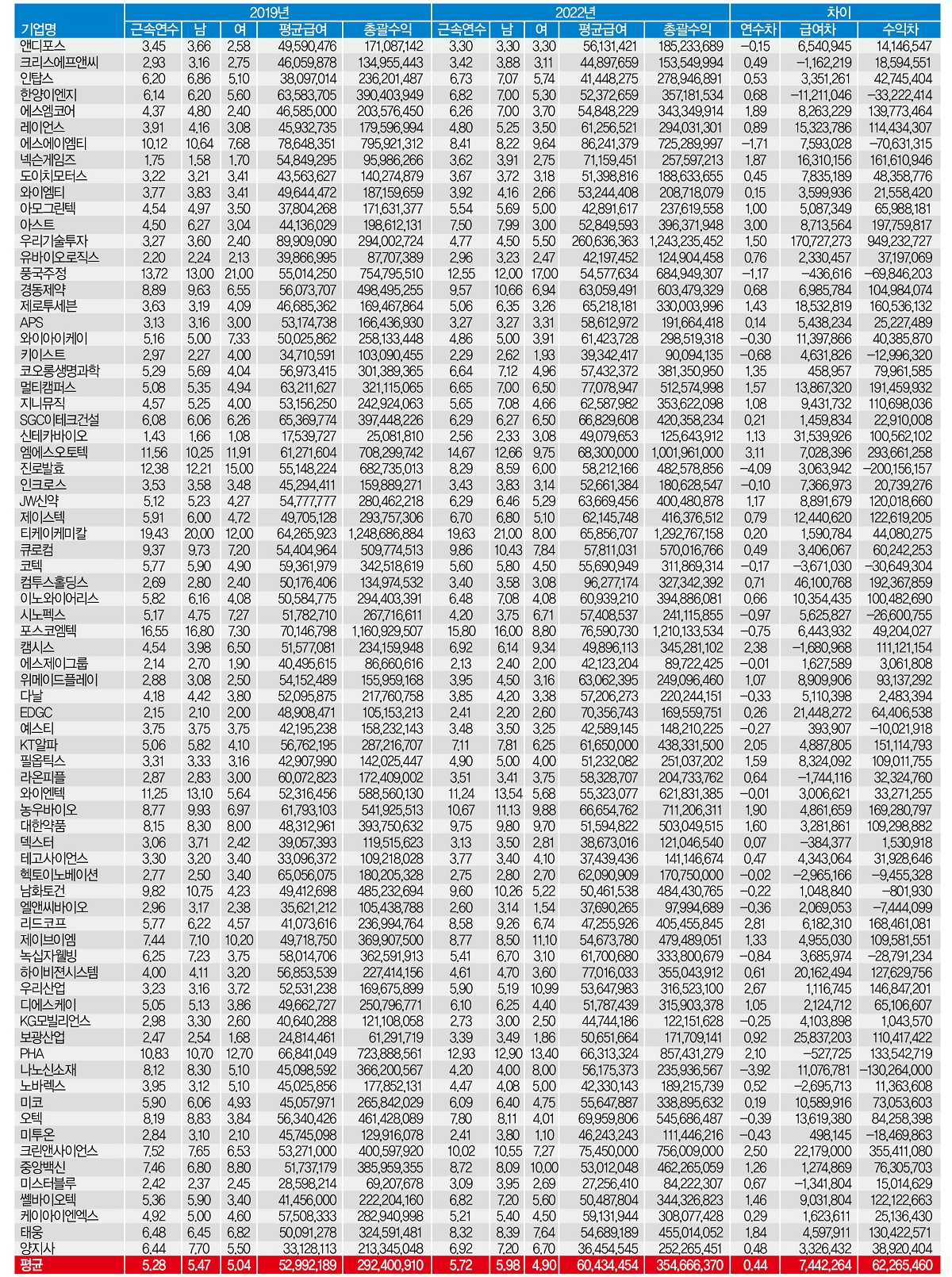 평균 근속연수는 5.72년으로 2019년 대비 0.44년 길어졌다. 이 기간 300대 기업의 평균 직원 수가 늘었다는 점(2019년 414명→2022년 465명)을 고려하면 실제 회사를 버티는 직원들이 그만큼 많았다고 풀이할 수 있다. 우리나라 직장인 대부분이 버티고 또 버티면서 팬데믹이란 긴 터널을 통과했단 거다.