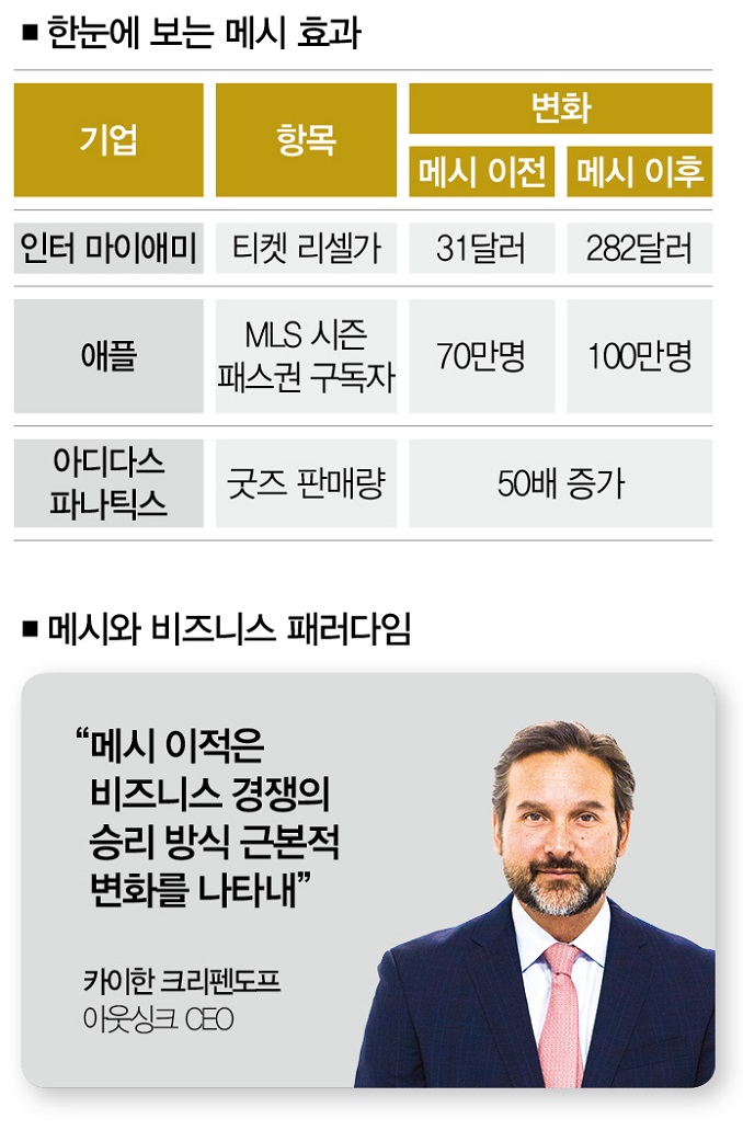 “과도할 만큼의 자금을 지원하는 사우디리그 대신 상대적으로 ‘가난한’ 인터 마이매이에 합류한 메시의 선택은 축구 경기장을 뛰어넘는 교훈을 담고 있다. 이는 비즈니스 경쟁에서 승리하는 방법의 근본적인 변화를 나타낸다.” 달리 해석하면 메시의 미국행이 새로운 비즈니스 방식과 상관이 있다는 거다. 크리펜도프의 말을 좀 더 면밀히 들여다보자.