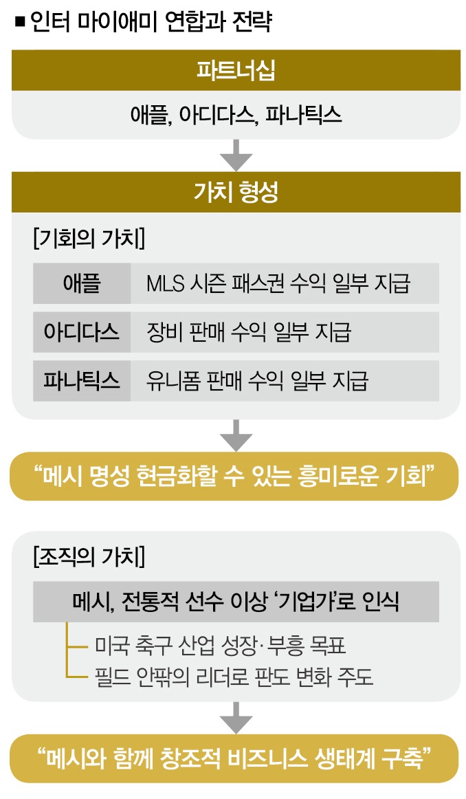 ■ 메시 잡기➊ 기회의 가치 = 인터 마이애미는 흥미롭게도 세곳의 글로벌 거대 기업과 손을 잡았다. IT빅테크 애플, 스포츠의류 기업 아디다스, 세계 최대 라이선스 스포츠 상품 공급사 파나틱스다.