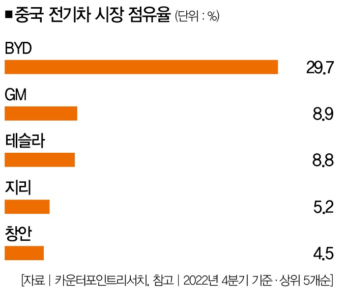 구기보 숭실대(글로벌통상학) 교수의 설명을 들어보자. “앞으로 전기차를 포함한 전세계 자동차 시장은 중국 기업이 주도할 것으로 전망한다. 지금도 비야디(BYD)와 같은 중국 전기차 브랜드가 세계로 뻗어 나가고 있다. 중국 기업과의 승부에서 밀리면 단지 중국뿐만 아니라 글로벌 시장 전체를 놓치는 격이다. 테슬라가 유난히 중국에 집중하는 것도 이곳에서의 경쟁 우위를 바탕으로 중국 전기차 기업들의 글로벌화를 차단하기 위한 노력으로 볼 수 있다.”
