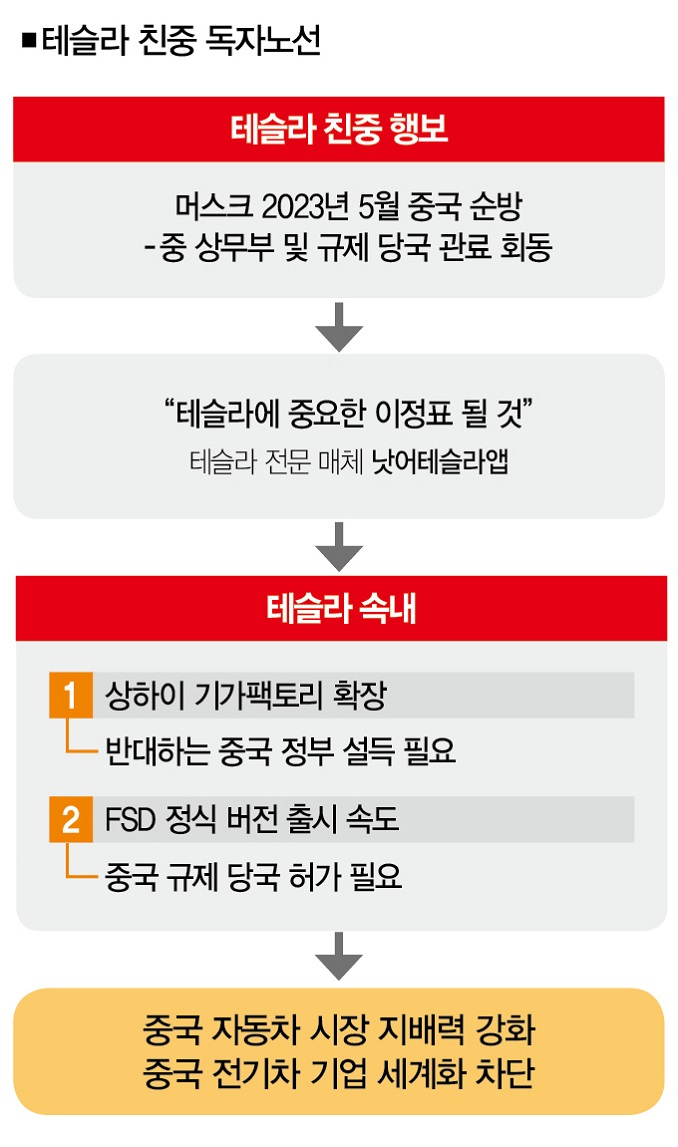 # 이 지점에서 눈여겨봐야 할 곳이 있다. 전기차 메이커 테슬라다. 중국과의 거리두기가 그 어느 때보다 가속화하는 시점에서 테슬라는 되레 중국을 향해 러브콜을 보내고 있다. 지난 5월 일론 머스크 테슬라 CEO가 중국을 방문해 고위 관료들을 만난 건 이를 단적으로 보여주는 사례다.