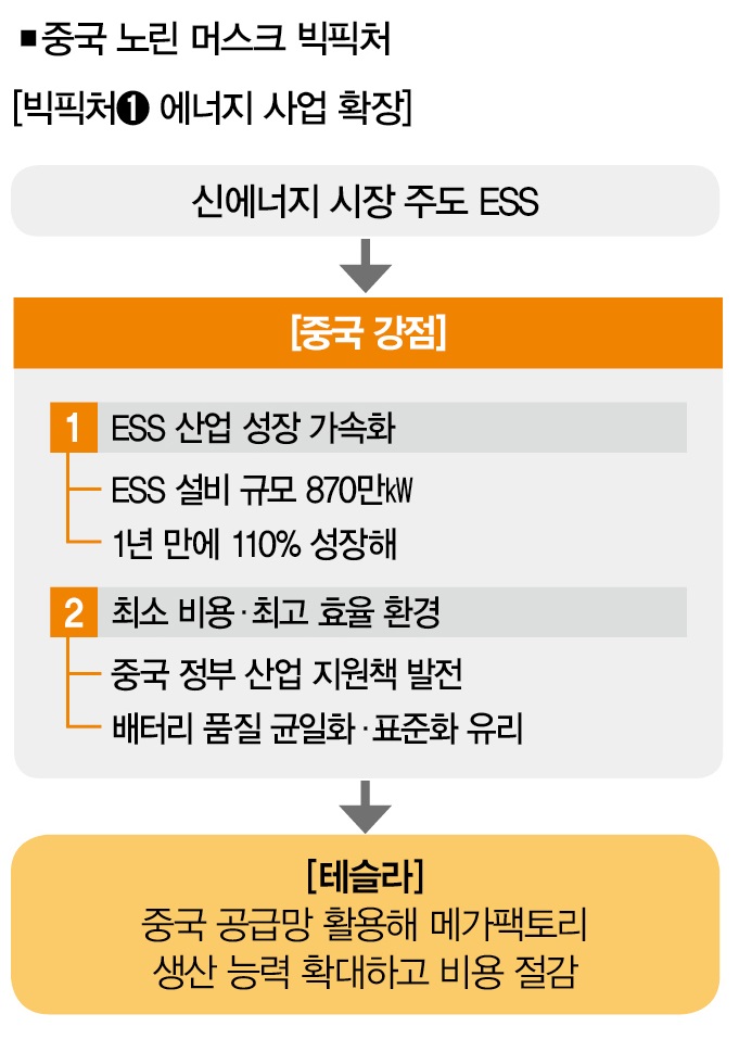 답은 간단하다. 머스크가 중국 시장에서 성취하려는 목표가 단지 전기차 산업에만 있는 게 아니라서다. 머스크의 ‘차이나 플랜’은 이미 테슬라의 미래 사업인 에너지 분야와 위성통신 산업으로 뻗어 있다. 이 두가지는 머스크가 훨씬 더 장기적 관점에서 중국 시장에 접근하도록 만드는 핵심 요인이다. 머스크의 빅픽처엔 과연 어떤 계산이 깔려 있는 걸까.