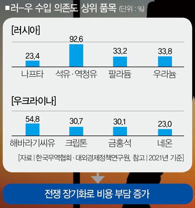 러시아-우크라이나 전쟁의 장기화는 우리나라 경제에도 득이 될 게 없다. 한국무역협회 수출통계에 따르면, 우리나라는 나프타를 비롯해 원유·유연탄·천연가스·무연탄 등의 원재료를 러시아로부터 수입하고 있다. 우크라이나도 2021년 기준 곡물(8위)과 해바라기씨유(9위) 등을 수입하는 우리나라의 주요 거래국 중 한곳이다.