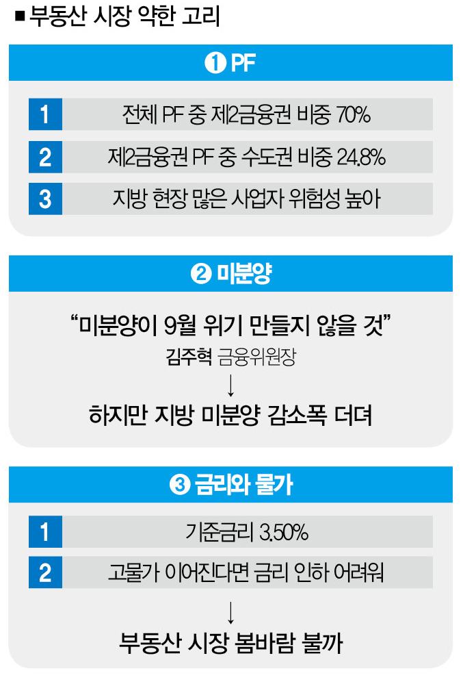 “부동산 연착륙이 필요하다.” 올해 초 정부가 부동산 시장을 평가한 말이다. 건설사 등 부동산 사업자가 받은 대출의 연체율이 상승하고, 분양시장의 열기가 식을 때였다. PF(프로젝트 파이낸싱) 대출은 땅을 사들이고 건물을 지을 때 필요한 대출이다. 나중에 부동산을 분양해 계약금ㆍ중도금ㆍ잔금이 들어올 때까지 사업을 버티게끔 해주는 일종의 마중물이다.