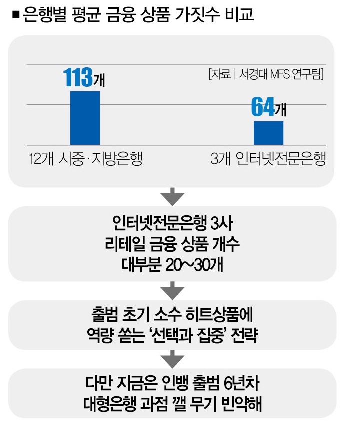 다양성이 부족한 인터넷전문은행의 상품군은 시중ㆍ지방은행과 비교하면 훨씬 더 잘 드러난다. 서경대 MFS 연구팀이 분석한 9개 상품군을 기준으로 따져보면, 시중ㆍ지방은행은 평균 113개의 제품을 앱에 등록한 반면, 인터넷전문은행은 평균 64개에 불과했다.