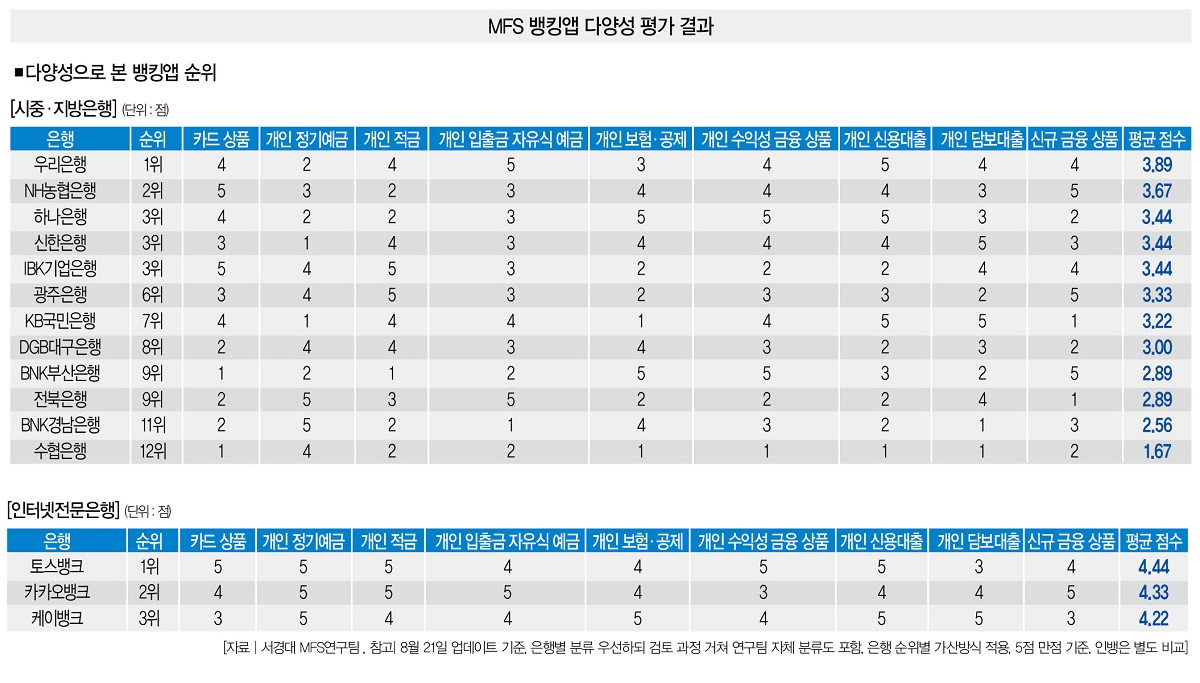 # 그럼 어떤 은행이 가장 많은 상품군을 선보이고 있을까. 더스쿠프가 서경대 MFS 연구팀과 함께 국내 뱅킹앱의 다양성을 분석했다.
