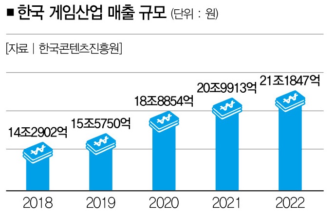 우리나라가 게임만 잘하는 게 아니다. 게임을 만드는 실력도 상당하다. 2022년 국내 게임 산업의 매출 규모는 21조1847억원이었다. 2021년 사상 처음으로 20조원을 넘어섰고, 더 성장했다. 국내 전체 콘텐츠 산업 매출에서 차지하는 비중은 14.3%였다.